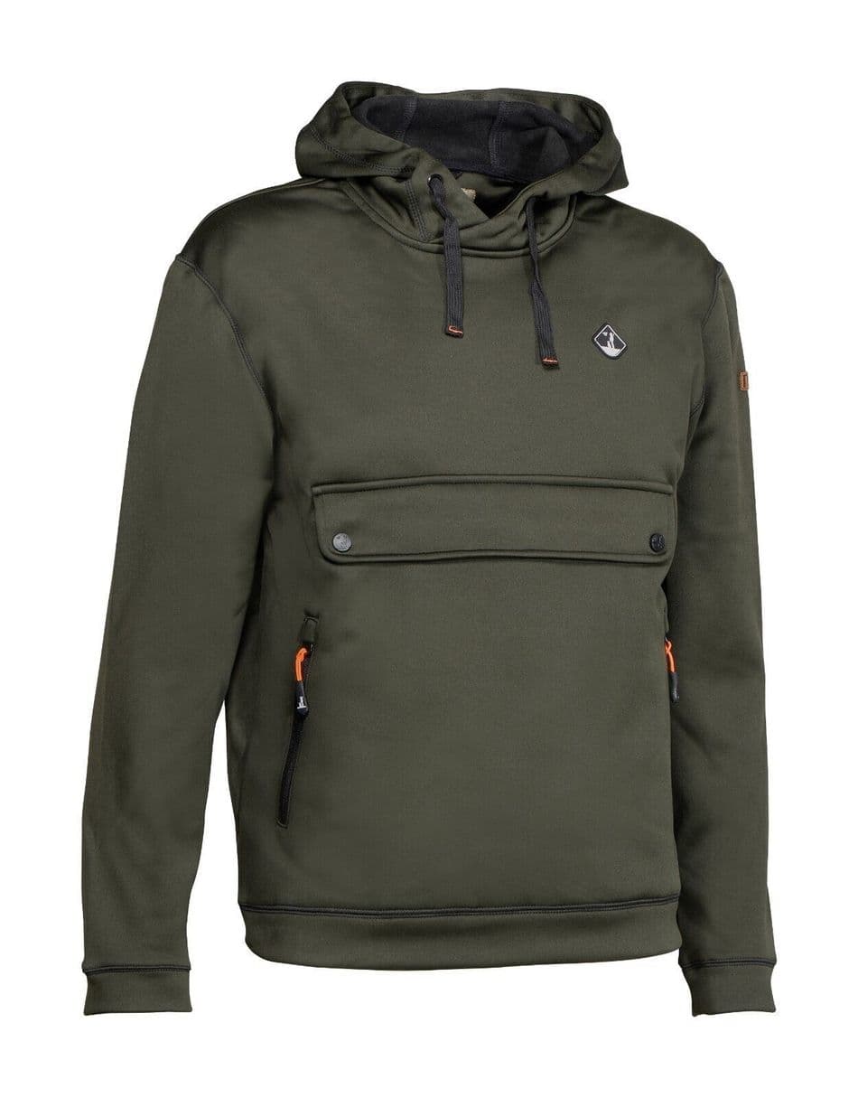 Percussion green hooded sweatshirt in softshell material. Soft and lightweight but with a fleece interior for extra warmth.